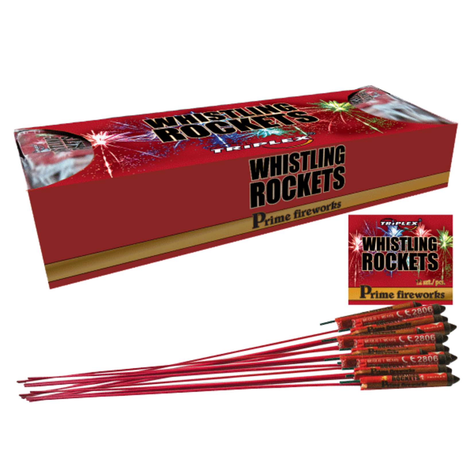 144 vuurpijlen van Triplex met fluiteffect en harde knal.