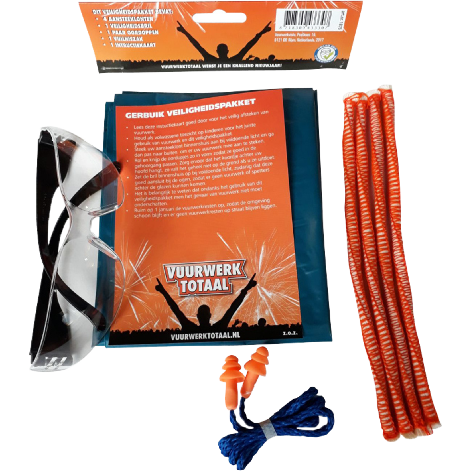 4 x Anzündschnur, Ohrstöpsel, Schutzbrille, Müllsack.