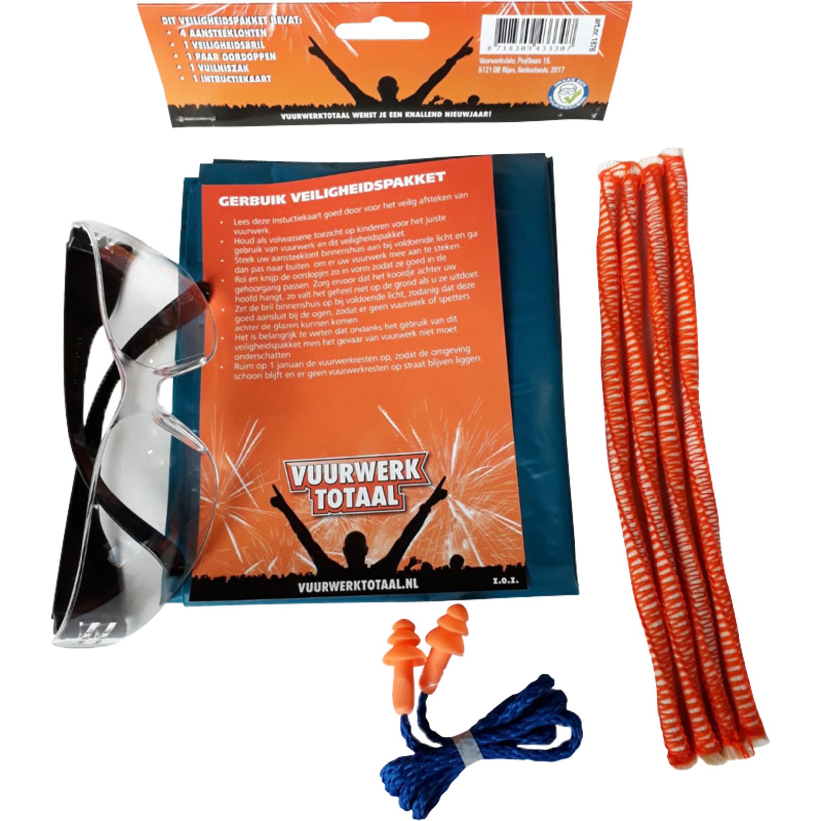 4 x aansteeklont, oordopjes, veiligheidsbril, afvalzak.